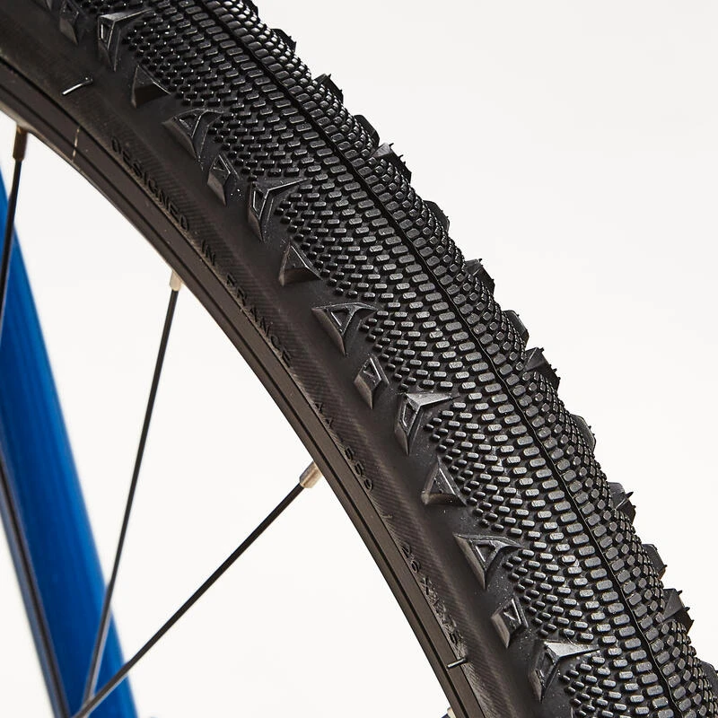 Ce vélo est équipé de pneus mixtes avec des crampons latéraux permettant de rouler aussi bien sur chemins que sur bitume. Chambre à air 20 pouces section 1,7 à 2,2, valve schrader..