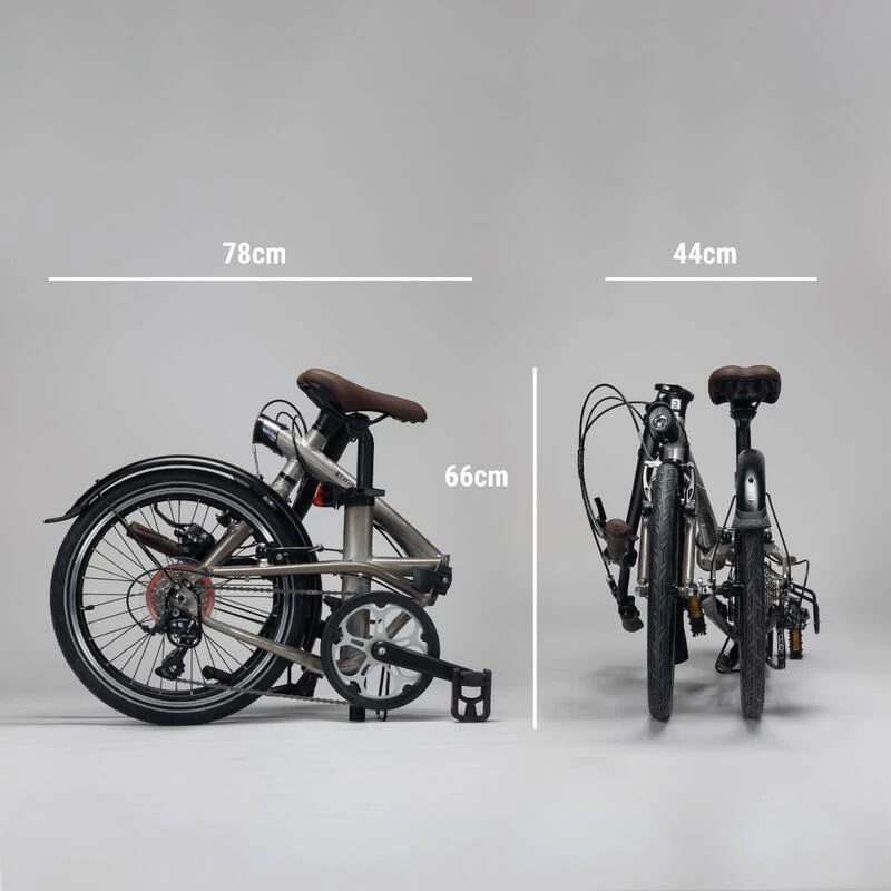 Une fois les pédales pliées et la potence rabattue, le vélo peut être rangé le long d’un mur avec un encombrement réduit (26 cm de largeur).